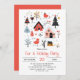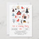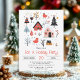 Estilo de arte popular escandinava paisagem de inverno festas de Natal Convite. Apresenta um cenário de inverno com casas, árvores e animais.