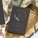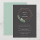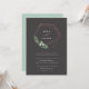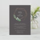Nosso convite para o casamento com a Greenhouse mostra seus nomes cercados por uma coroa geométrica moderna de fios falsos de folhas de cobre, folhagem botânica verde, folhas e flores brancas minúsculas. Personalize este convite de casamento botânico moderno e elegante com seus detalhes de casamento em letras brancas chic num fundo de tons ricos.