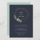 Nosso convite para o casamento com a Greenhouse mostra seus nomes cercados por uma coroa geométrica moderna de fios falsos de folhas de cobre, folhagem botânica verde, folhas e flores brancas minúsculas. Personalize este convite de casamento botânico moderno e elegante com seus detalhes de casamento em letras brancas chic em um impressionante fundo azul-marinho.