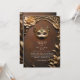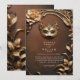 Evoque a magia de uma bola de mascarada com este belo convite de casamento. Um fundo marrom rústico e enferrujado adornado com um intrincado decoro decorativo simulado em ouro e folhagem 3D e flores cria uma atmosfera luxuosa e encantadora. A máscara do mascarada ouro toma o palco central, adicionando um elemento de mistério e glamour ao seu dia especial.