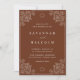 Convites de casamento formais e de estilo vintage, com um enquadramento detalhado do ornamentado em torno de seus detalhes. Cor alaranjada escura.