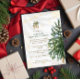 Design elegante com tema de férias, com um fundo suave de cetim branco, uma árvore de Natal decorada com ornamentos brancos à direita e com lanternas brancas penduradas acima. Dois sinos festivos com verde acrescentam um toque sazonal clássico.
