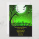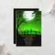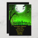 Um esqueleto assustador caminhando em um quintal com lua de cheio e fundo verde do céu. Muito divertido e assustador design para seus convites para o Festa de Halloween.