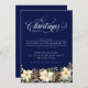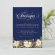 Convite de festas azul de Poinsettia de Natal Branco. Reúna amigos ou família para a sua festa de Natal. Esta é uma época do ano para eventos sociais, compartilhando risos e construindo memórias. O guião branco de Natal, juntamente com a aquarela Poinsetta, bagas e cones de pinheiro, é um tradicional design de Natal, numa cor azul-profunda moderna. Adicione o texto personalizável adicional na parte traseira ou exclua. Veja os outros produtos correspondentes nesta coleção para um tema coeso.