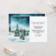 Um convite de festas de natal com uma pintura de aquarela. Pinheiros cobertos de neve numa cena do inverno. Flocos de neve caindo em um chão coberto de neve. Nuvens brancas e azuis fluffy no céu. Com um lago congelado no fundo. Moody vibe pacífica