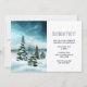 Um convite de aniversário com uma pintura aquosa. Pinheiros cobertos de neve numa cena do inverno. Flocos de neve caindo em um chão coberto de neve. Nuvens brancas e azuis fluffy no céu. Com um lago congelado no fundo. Moody vibe pacífica