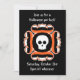 Um simples crânio branco em um rico de laranja, preto e branco nos convites para o Halloween. Adicione seus detalhes a eles. São amigáveis para a família e não assustam as crianças.