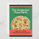 Um Convite de festas de pizza divertido. A ilustração colorida de uma torta de pizza sobre um fundo verde claro é acentuada com listras vermelhas e pretas. Usando o botão de edição, você pode substituir o texto pelas informações de sua parte. A parte de trás do convite tem um menu de pizza para a festividade, que também é totalmente personalizável.