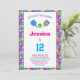 Convite de aniversário verde, rosa, amarelo e roxo Pickleball. Totalmente personalizável. Dois redemoinhos coloridos e picleball verde. Com placa RSVP na parte traseira