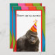 convite de aniversário de animais de festas engraçadas mostra uma foto de um gorila. O gorila tem um chapéu de festa na cabeça com listras laranja, amarelas e roxas. O gorila da festa está sobre um fundo branco com trim vermelho. O fundo geral do design é a faixa azul, verde, rosa e laranja, como listras sobrepostas. Há um texto personalizável em fonte preta divertida que diz "Festa como um animal!" O verso do convite tem o mesmo plano de fundo de design de fita sobreposto e a mesma área branca sólida com limite vermelho. Na área branca há texto personalizável em fonte preta onde você pode adicionar todos os detalhes da festa de aniversário. O convite de aniversário perfeito para o gorila e o amante primata!