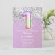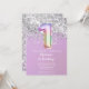 Convite de festa de aniversário brilho glitter arco-íris para uma menina de 1 ano com escrita elegante e balões de número foil divertidos.