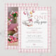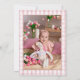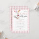 Este convite de primeiro aniversário encantador apresenta um pequeno ganso fofo segurando balões, um fundo xadrez rosa e uma foto no verso. Criado por Thisisnotme©
