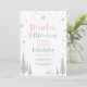 Celebre seu dia especial com este convite moderno de aniversário de 1 ano Winter Onederland! Este design apresenta uma cena de inverno com flocos de neve prateados, árvores, cervos e uma tipografia estilosa "Winter ONEderland" em tema de cores rosa, azul e prata. Convite perfeito para uma festa de primeiro aniversário de inverno para menina.