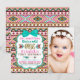 Convite de festa de 1º aniversário tribal para meninas com flechas tribais e laço azul escuro em um lindo fundo com design nativo americano sudoeste azteca. Você pode personalizar facilmente este adorável convite de primeiro aniversário tribal simplesmente adicionando sua foto e detalhes do evento. Este é um design impresso sem laços reais, glitter, etc.