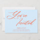 Este convite de festa de aniversário apresenta "Você está convidado" em um grande e amplo script laranja sobre um fundo azul celeste suave, com os detalhes da festa em pequeno texto negrito abaixo. É um visual divertido e confiante que parece fresco e comemorativo. Há espaço para o nome do convidado de honra, idade, data, local e informações de RSVP. É mostrado aqui como um convite de 21º aniversário, mas funciona igualmente bem para qualquer idade - ou, honestamente, qualquer celebração em que você queira que o convite se sinta um pouco especial.