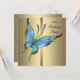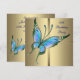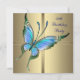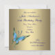 Convite de aniversário de 50 anos para mulher, elegante em dourado com belo azul-teal e borboleta roxa.