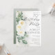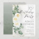 Celebre um marco especial com este convite de aniversário de 70 anos, elegante e sofisticado, com rosas brancas românticas e folhagens de eucalipto. Este design floral sofisticado combina o estilo botânico atemporal com tipografia moderna, criando um convite lindo para uma celebração de aniversário elegante.