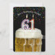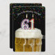Velas de aniversário número 61 em caneca de cerveja com confete colorido em preto para convite para festa de aniversário de 61ruas.
