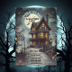 Casa assombrada, convite de festas de adultos do Dia das Bruxas Gótico. Atrevo-me a atravessar o portão para a desgraça com este sinistro convite da festa do Dia das Bruxas em estilo aquarela. Uma casa gótica assombrada fica sob uma lua com morcegos fluindo sobre a lua. Um caminho bobo com crânios, um gato preto e lanternas de jack O' e lanternas tremendas nos lados leva à casa. A cena também apresenta portas de ferro, janelas brilhantes e fantasmas. Toda a cena é banhada num brilho sinistro e estranho, realçado por uma atmosfera de cinza escura que oscila através do nevoeiro e do céu. Todos os detalhes murmuram um acolhimento assustador e este convite é ideal para festas caseiras assombradas, reuniões fantasmas, e sarauís adultos do Halloween onde o mistério encontra a lua.