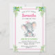 excelente de convite de elefante verde e rosa para o aniversário de uma menina. Inserções, sinais, jogos e decorações correspondentes podem ser encontrados em nosso compro Zazzle.