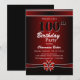 Um convite de aniversário preto e arrojado 100º com texto branco e uma fita e arco vermelho e branco. Substitua os detalhes deste convite por você para criar o convite de aniversário perfeito para o seu evento.