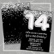 Convite de aniversário preto branco e 14 de prata 14 para um menino ou menina com roteiro moderno escrevendo e balões de folha divertida.