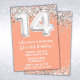 Convite de aniversário de prata e 14 de cor prata 14 para um menino ou menina com moderno roteiro escrevendo e balões de folha divertida.