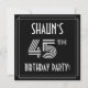 A frente deste elegante design de 45 convite de aniversário de placa de apresenta um nome editável, um deco de arte de rico parece inspirado número "45", a mensagem "FESTA DE ANIVERSÁRIO!" e uma borda de várias linhas. Por padrão, há um fundo de cor preta na parte frontal, mas ele pode ser personalizado para uma cor diferente se desejar. A parte traseira apresenta detalhes personalizados sobre o evento, como data, hora, local/local e quaisquer outras informações que possam ser relevantes. Convites elegantes, na moda, personalizados como estes podem ser usados para convidar convidados/participantes para uma festa de aniversário que está sendo realizada para celebrar o 45º aniversário de alguém. [~Z0000615]