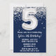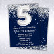 convite de aniversário azul marinho e prata de 5 de idade 5 convite de aniversário com brilho e moderno guião escrevendo e balões de folha divertida.