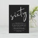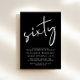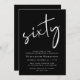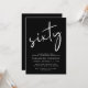 Convite preto para sua 60ª festa de aniversário com "sessenta" mostrado em um grande roteiro branco, seu nome em uma tipografia elegante de serifpografia branca e os detalhes da festa em letras brancas simples.