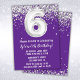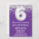 Convite de aniversário de 6 roxo e prateado com 6 anos de idade com brilho e moderno roteiro escrevendo e balões de folha divertida.