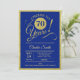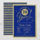 70 convite de aniversário para homens ou mulheres. Cartão de convite elegante em azul real com folha de ouro falso brilhante. Apresenta a fonte do script de tipografia. Saúde para 70 anos! Pode ser personalizado em qualquer ano. Perfeito para uma celebração de um dia adulto.