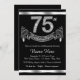 Elegante convite de aniversário preto e prateado 75º com números de diamante e banner sobre fundo prateado e preto. Este belo convite de aniversário prateado e preto 75º é facilmente personalizado para o seu evento. Esta design surpreendente funciona bem para um homem ou uma mulher. Este é um design impresso sem diamantes reais, prata, brilho, etc.