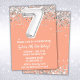 Convite de aniversário de 7 anos de 7 prateado e pêssego com brilho e moderno escrevendo de roteiro e balões de folha divertida.