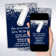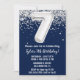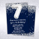 convite de aniversário azul marinho e prateado com convite de aniversário de idade 7 com brilho e moderno roteiro escrevendo e balões de folha divertida.