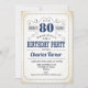 80 convite de aniversário para homens ou mulheres. Cartão de convite elegante em branco cremoso e azul marinho. Apresenta fonte de tipografia retrógrada. Saúde para 80 anos! Pode ser personalizado em qualquer idade. Perfeito para uma festa de na moda adulto.