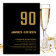 Um sofisticado convite de aniversário negro e 90 de ouro minimalista.