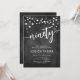 Convite de aniversário 90. Design preto e branco elegante com padrão de quadro. Cartão de convite moderno clássico com luzes de fada e fonte de script. Perfeito para uma comemoração de na moda 90 dias. Personalize com seus próprios detalhes. Pode ser personalizado para qualquer idade! Impressos convites Zazzle ou modelo de impressão digital instantânea para download.