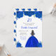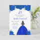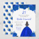 Este convite de aniversário apresenta flores florais azuis reais e brilhantes e uma bela princesa de cabelo castanho e um vestido elegante. Isto é perfeito para uma festa de aniversário.