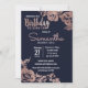As elegantes, quentes e simples e modernas flores rosa douradas impressas e a tipografia em fundo azul marinho, Convites de festas de aniversários. Este design clássico e sofisticado é perfeito para o indivíduo clássico, na moda e tradicional de Aniversário. Personalize com sua própria mensagem na frente e monograma personalizado no verso. Todos os impressão
