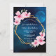 Uma floral tropical sob as estrelas 50ª (ou qualquer idade) convite de aniversário com flores de hibisco cor-de-rosa, verde e uma estrutura geométrica falsa de ouro. Um céu azul escuro com uma lua de cheio como fundo. Modelos para um nome escrito com um script de estilo manuscrito moderno, modelos para suas informações de partido. Texto branco. Perfeito para uma festa de verão, piscina ou praia! Verso: céu azul como fundo.