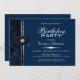Um convite de aniversário preto e azul moderno com um arco de presente preto e azul com um embelezamento de diamante no topo do nó. Apresentado de forma elegante em texto branco. Os detalhes relevantes são facilmente trocados por suas informações para seu evento especial.