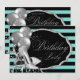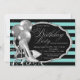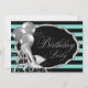Convite de festa de aniversário feminino preto e azul teal com sapatos de salto alto glitter prateado elegante e balões prateados em um belo fundo de listras azuis teal e preto. Este convite de festa de aniversário azul teal e preto é facilmente personalizado para o seu evento, basta adicionar seus detalhes no estilo de fonte de sua escolha. Este é um design impresso sem brilho real, etc.