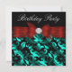 Convites de festa de aniversário de damasco vermelho e azul turquesa. Este convite de festa azul turquesa, vermelho e preto elegante é facilmente personalizado para o seu evento, adicionando os detalhes do evento, estilo de fonte, tamanho e cor da fonte e texto. Por favor, note que todos os adesivos, cartões e desenhos de convite que você encontrará no Zazzle são gráficos impressos sem joias, laços, relevos, rebaixados ou peças adicionais.