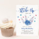 Cartão de convite de aniversário do garoto divertido com ilustração aquosa de uma bola de boliche atingindo alguns pinos com estrelas azul e vermelha voando. O texto diz "Vamos Atacar Alguma Diversão!"