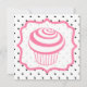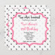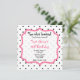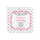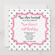 Um convite de aniversário com um fundo branco com bolinhas pretas pequenas na parte frontal e traseira. Quadros cor-de-rosa na frente e atrás. Personalize o texto na frente com detalhes do evento. Recursos do verso ilustram o cupcake rosa e branco.