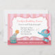 Venha certo acima e junte-se ao divertimento com este elefante bonito do bebê do circo dos desenhos animados em um direito que esteja estando em uma bola com teste padrão de estrelas e esteja fundindo confetes vermelhos e azuis fora de seu tronco. À esquerda é um leão de mar que joga com uma bola em uma plataforma. Fundo de listras doces do rosa pastel. Um design adorável para qualquer um que planeia um circo ou uma festa de aniversário temático do carnaval para o pouco umas. A menina do aniversário e os convidados das crianças estão indo ter tanto o divertimento! Personalize facilmente com seus detalhes do partido.