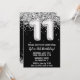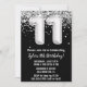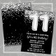 11 de Aniversário preto e branco 11 convite para um convite de aniversário de prata branca preta com escrevendo moderno de escrita e balões de folha divertida.