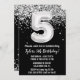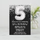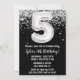 Convite de aniversário preto e branco com convite de aniversário de idade 5 com brilho e moderno e escrevendo de escrita e balões de folha divertida.