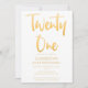 Introduzir um novo convite de festas aniversário de 21 anos moderno e elegante, fundo branco com texto de tipografia dourado escrito à mão "vinte e um". Personalize esta placa de modelo, adicionando as informações de sua própria parte.
